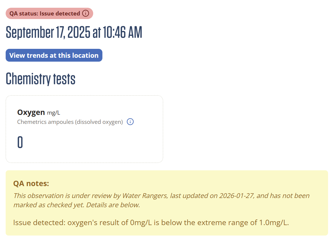 If you contribute data to a dataset on the Water Rangers platform, our automated QA works quietly in the background—no action required from you. The automated QA feature flags potential issues as soon as you enter an observation, and we’ve applied these same checks to all historical data on the platform.